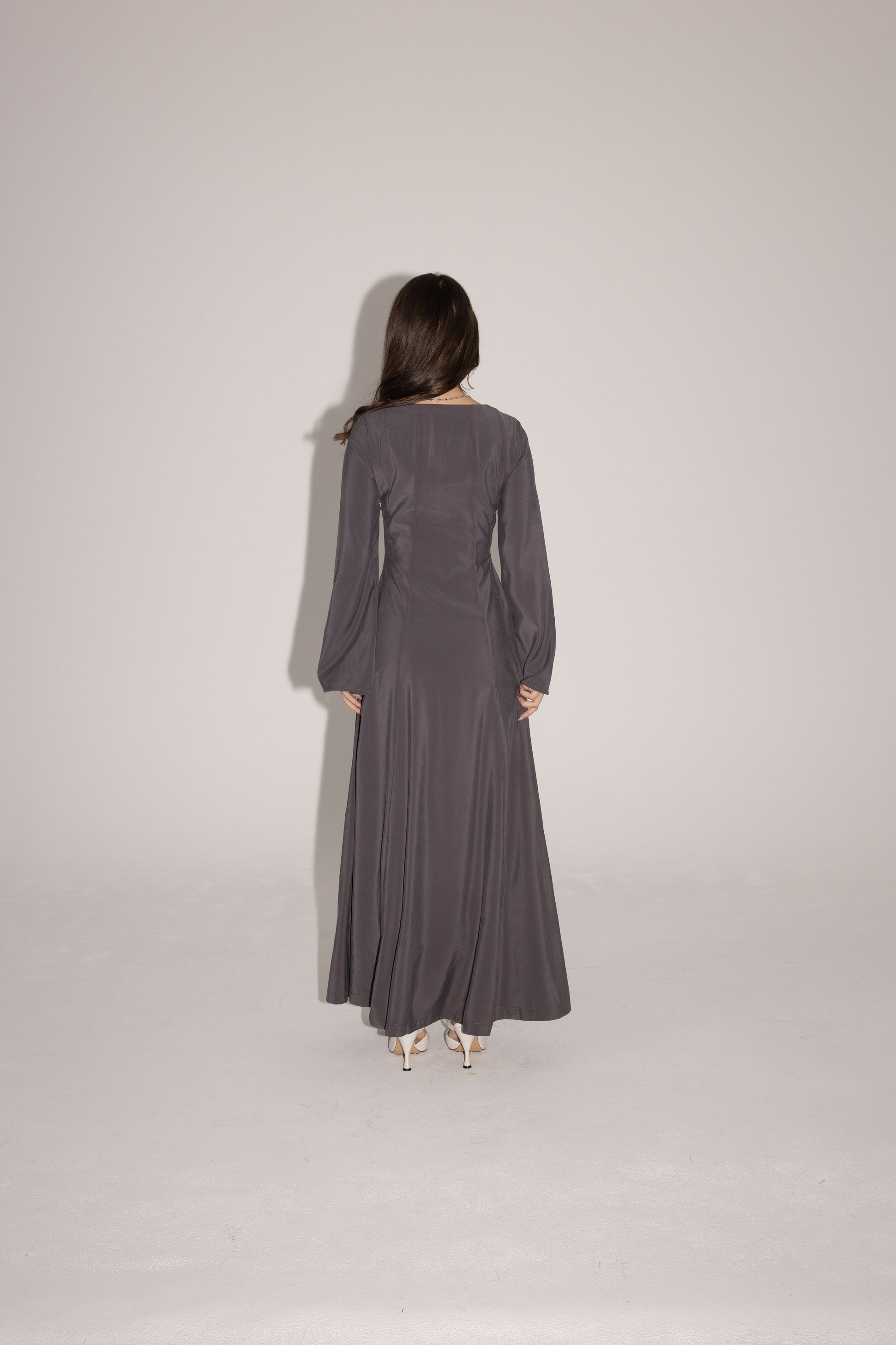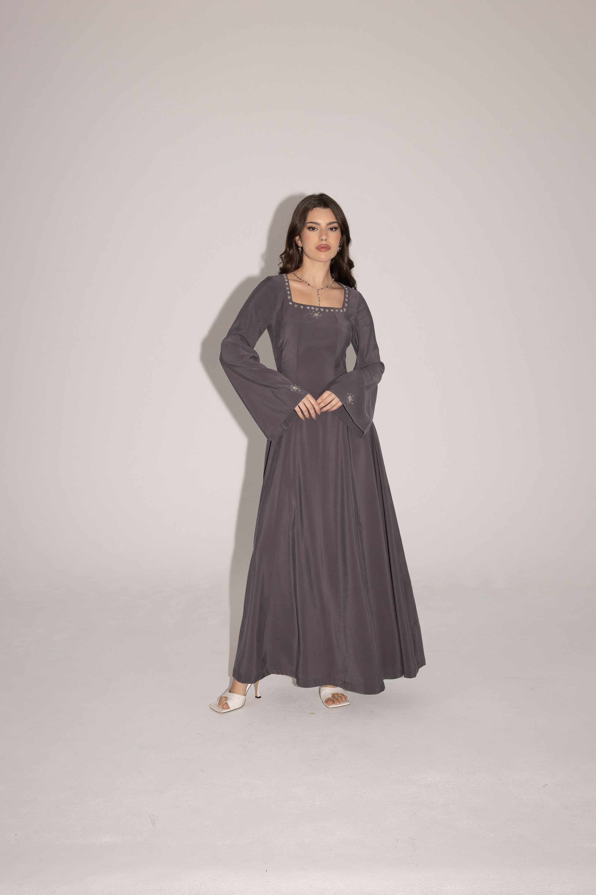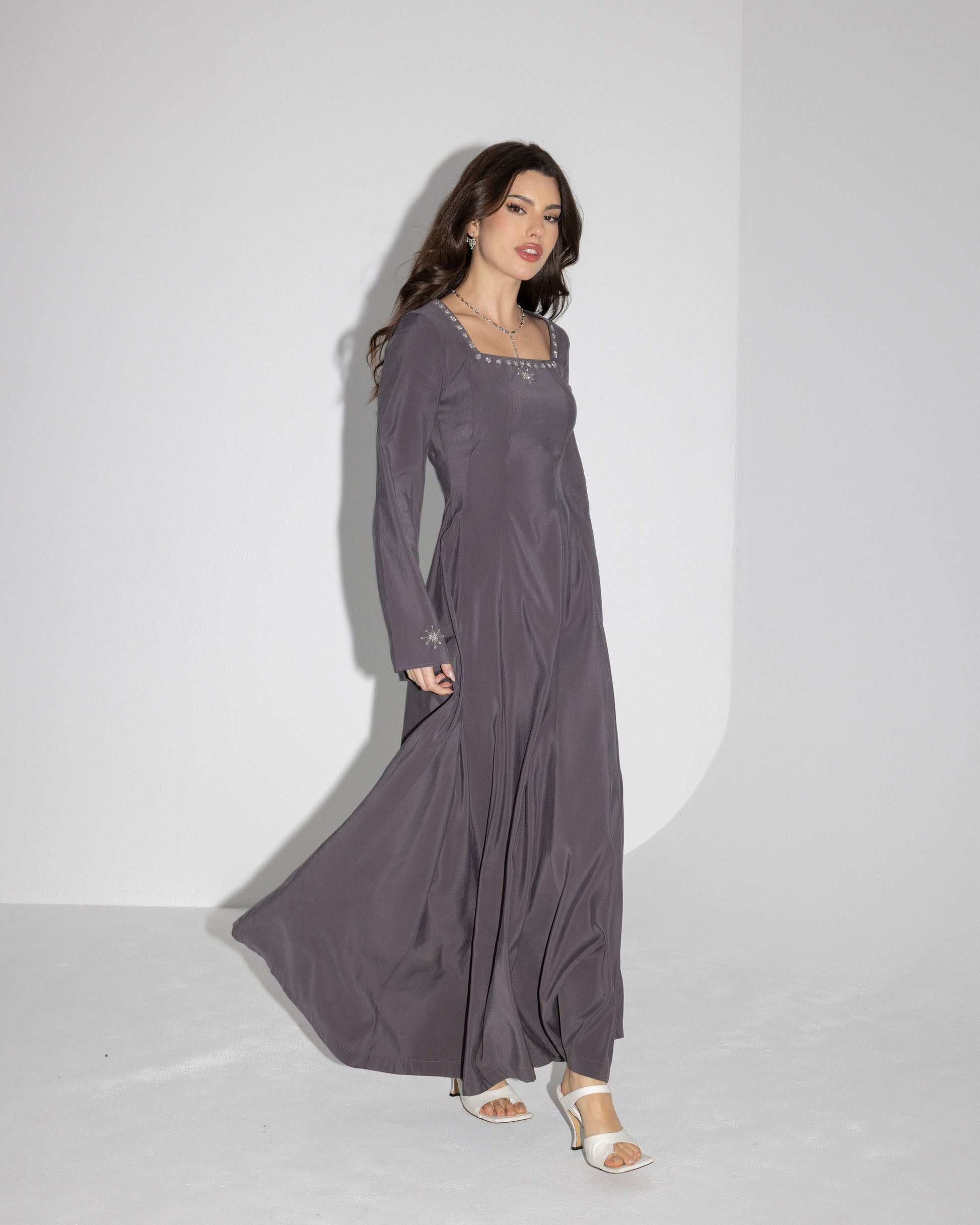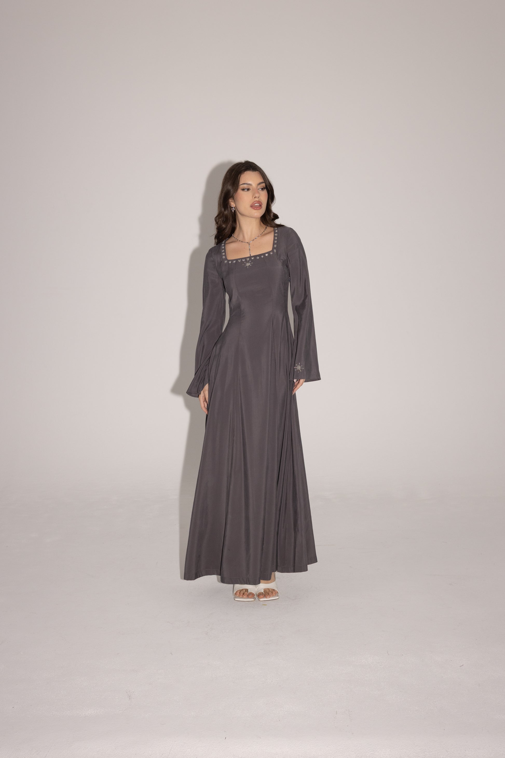 A soft grey flowing dress with a square neckline, subtle hand-embellished star details